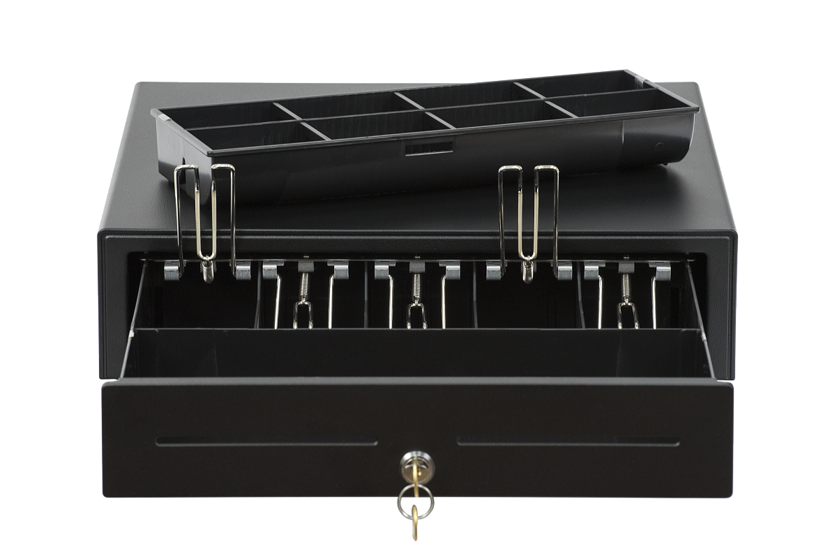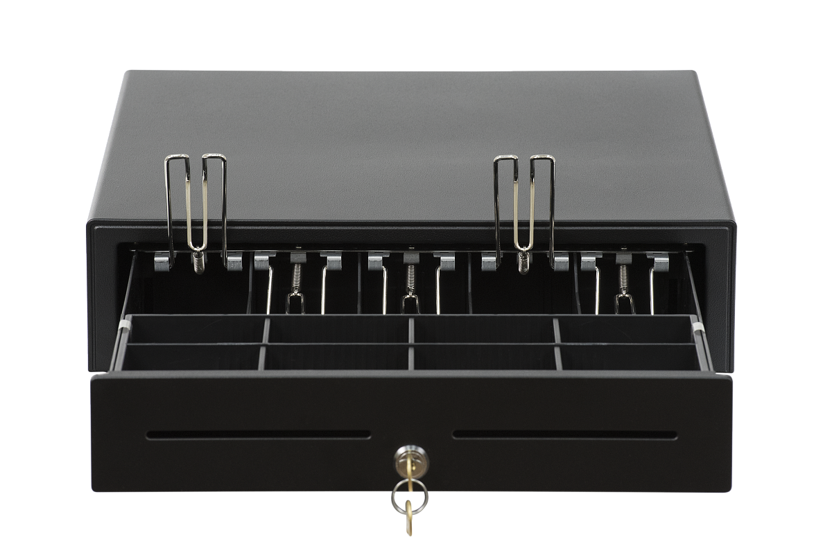 Корпус АТОЛ CD-410 выполнен из металла. В денежном ящике 5 отделений для купюр, 8 ячеек для монет и большое отделение для хранения чеков и счетов. Конструкция денежного ящика позволяет менять ширину отделений для купюр, а отделение для монет может выниматься из денежного ящика. Стальные зажимы для купюр долговечны и надежно фиксируют банкноты.