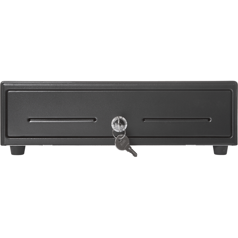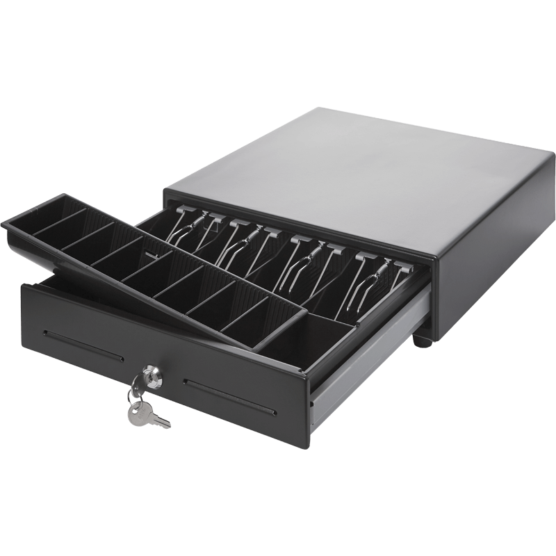 Внутренний пластиковый лоток на металлическом поддоне содержит 13 отделений для хранения: четыре прямоугольные ячейки с фиксаторами для купюр, восемь отделений с покатым краем для монет и дополнительный отсек для чеков и крупных купюр с доступом с передней панели. Размер внутренних отделений можно регулировать.