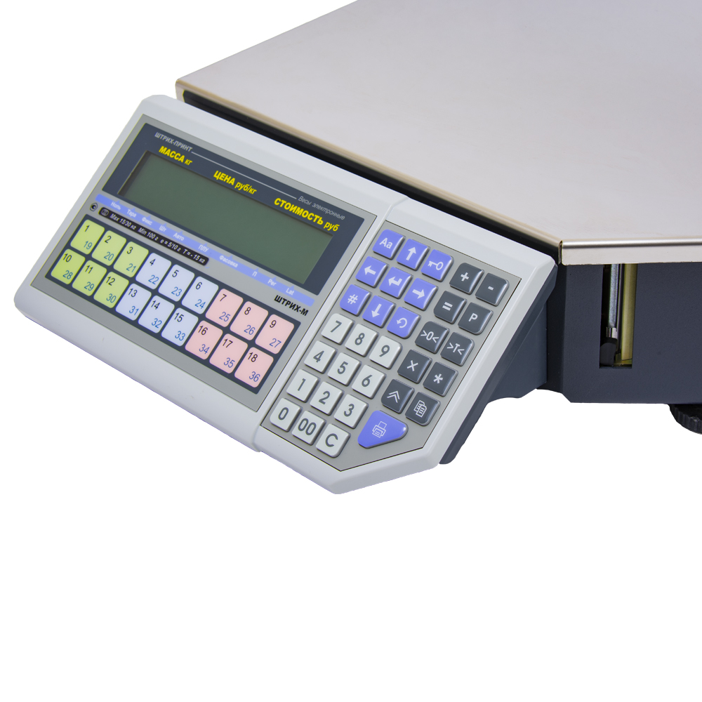 ШТРИХ-ПРИНТ ФI - фасовочные весы с печатью этикетки в привлекательном дизайне. Клавиатура весов и дисплей оператора с целью эргономики размещены внизу, так что оператору удобно вводить номер PLU товара.